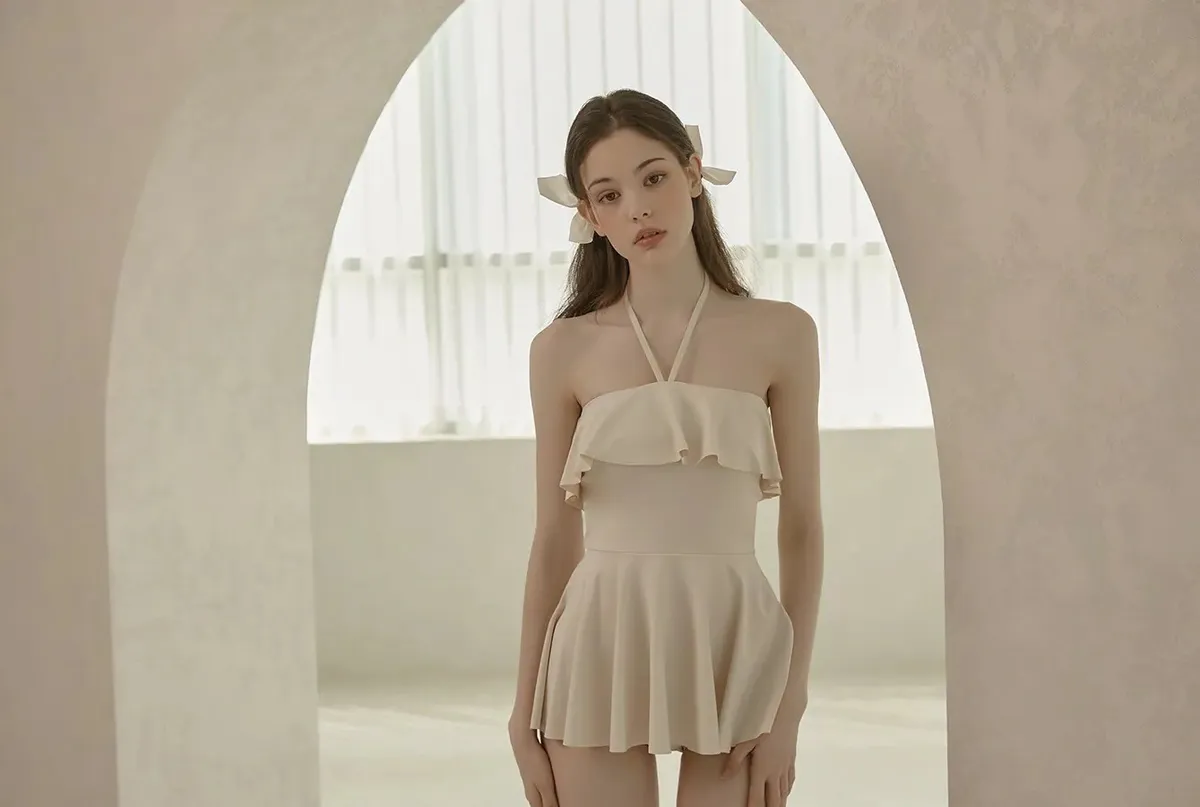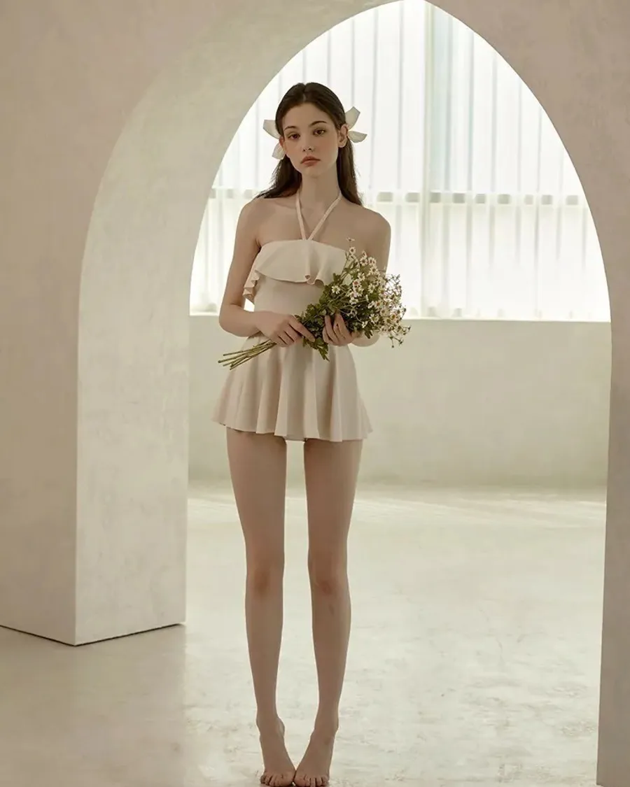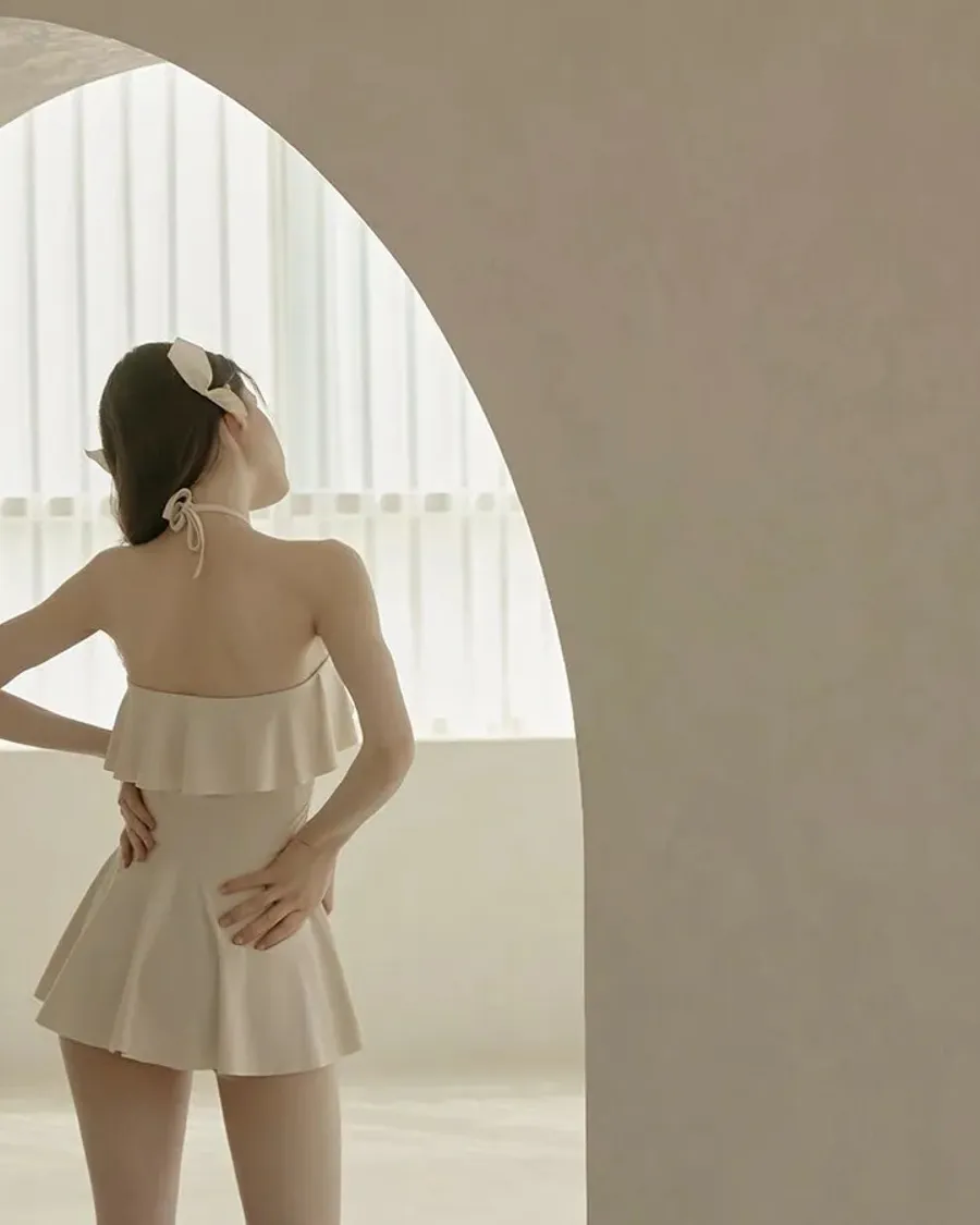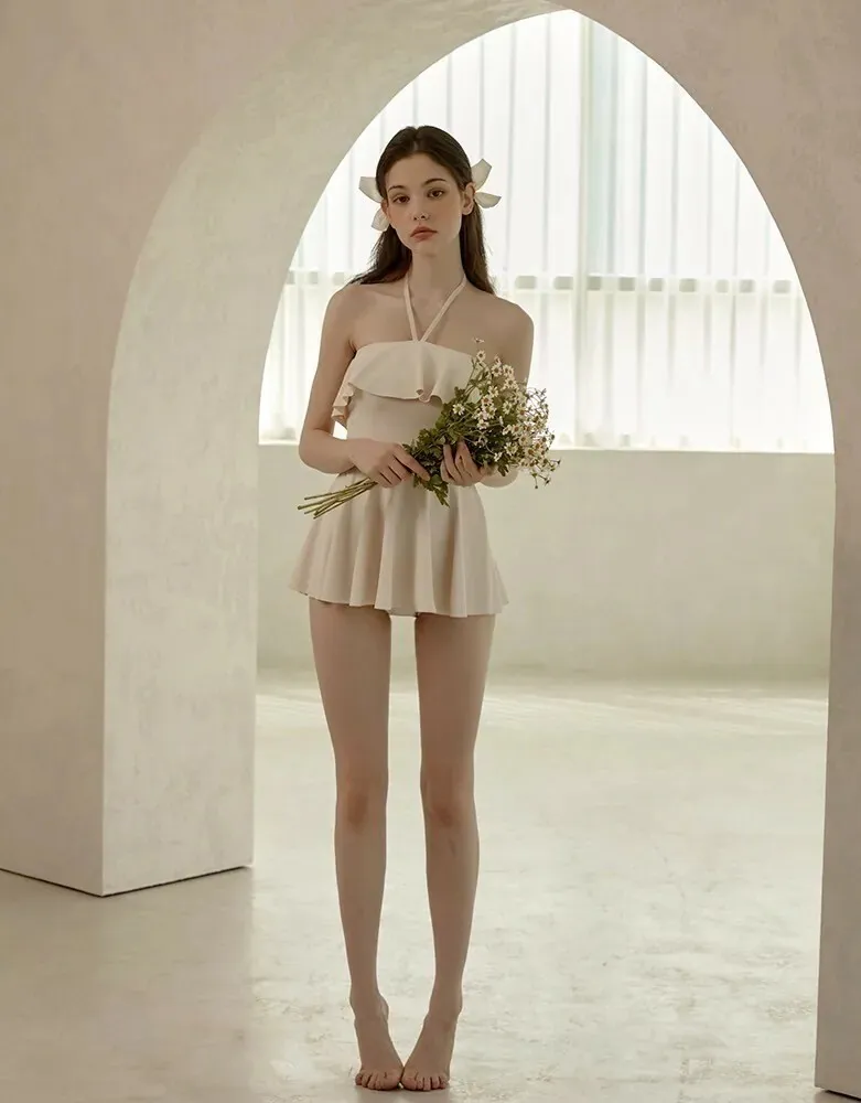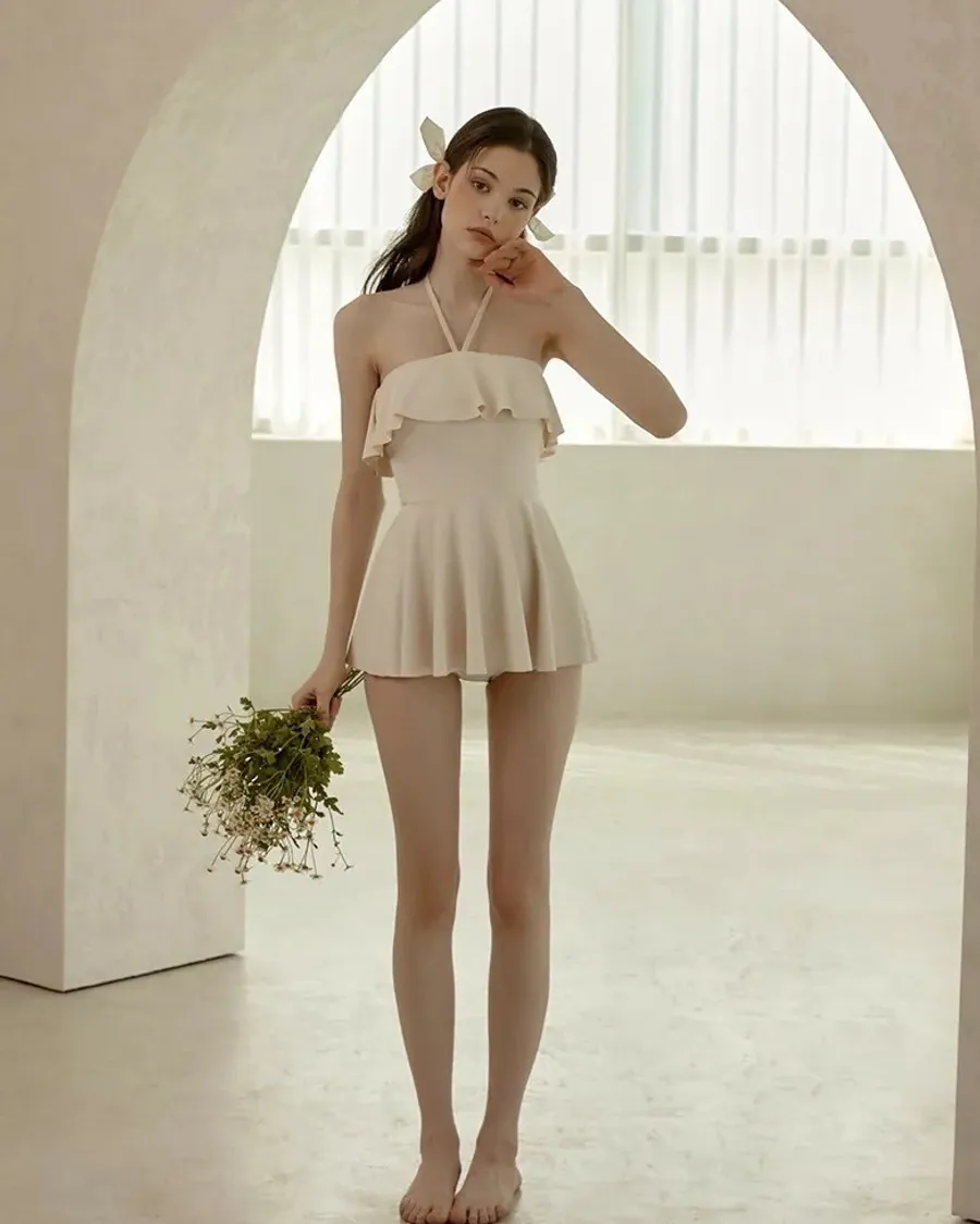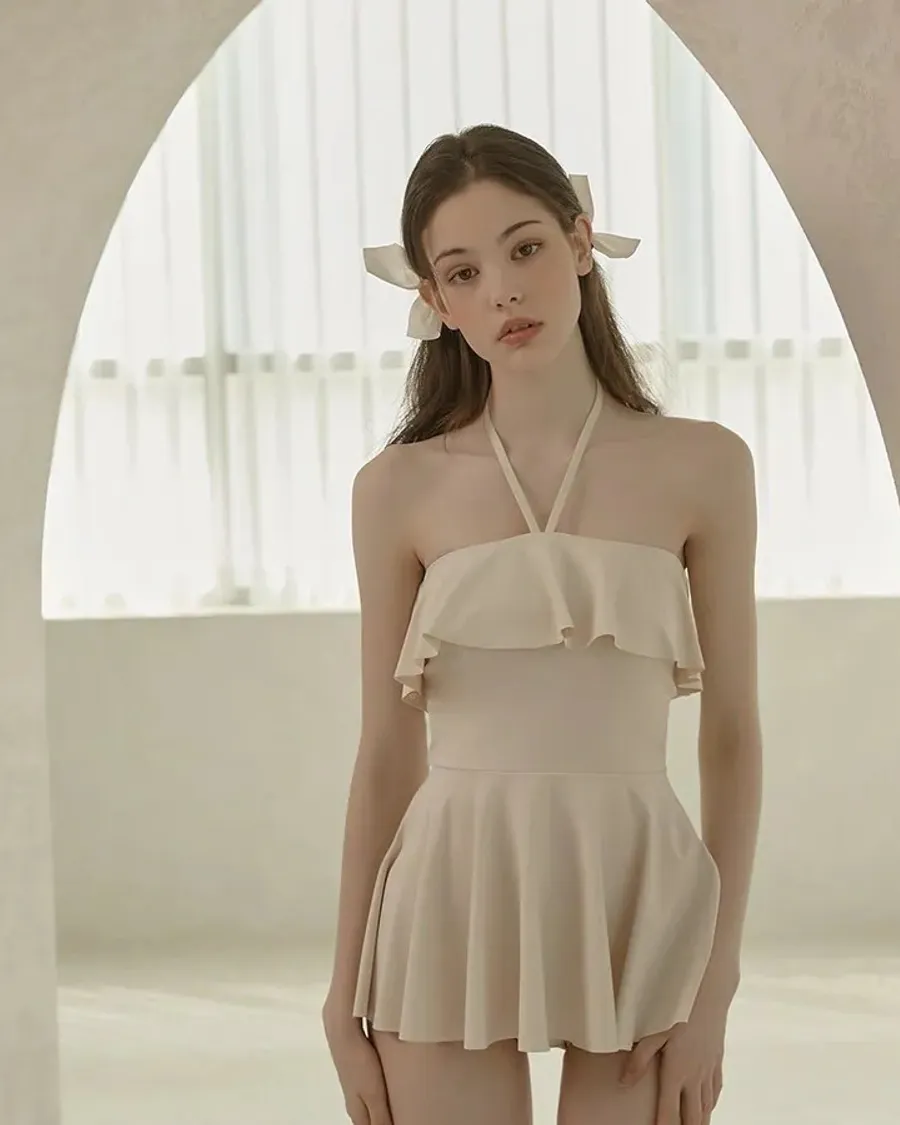 ANZ韓網代購🇰🇷VIKINIVENDER 奶油千層 掛脖連身泳裙 材質 聚酯纖維 82% 聚氨酯 18% 顏色 Ivory象牙色 尺寸( CM ) S / M 胸圍 34 / 36 臀圍 35 / 37 總長 57 / 58