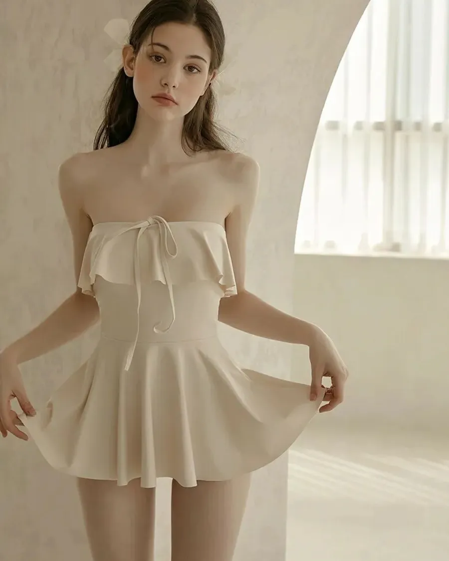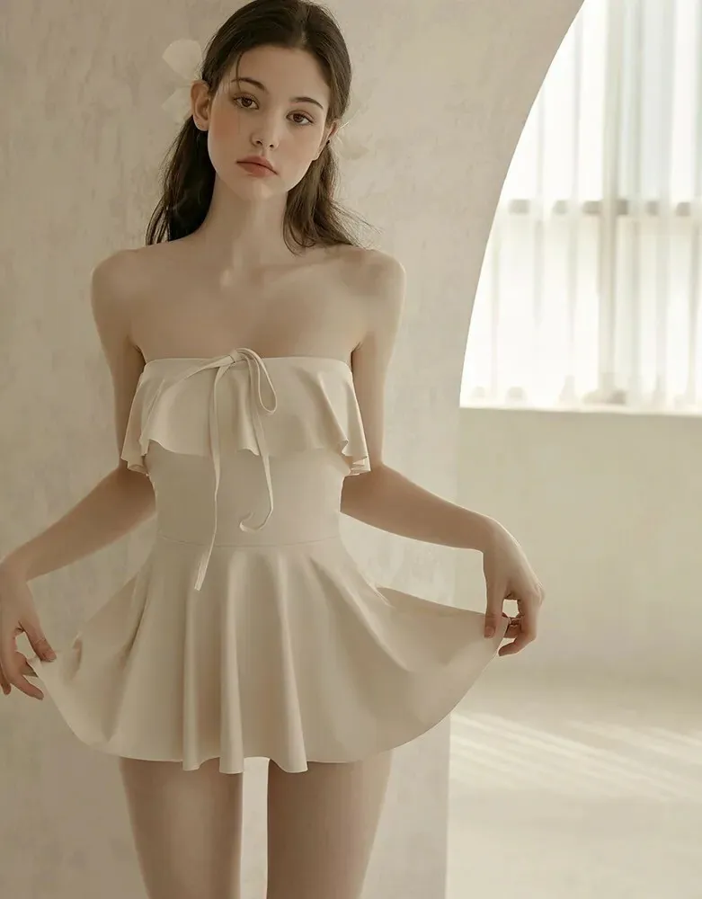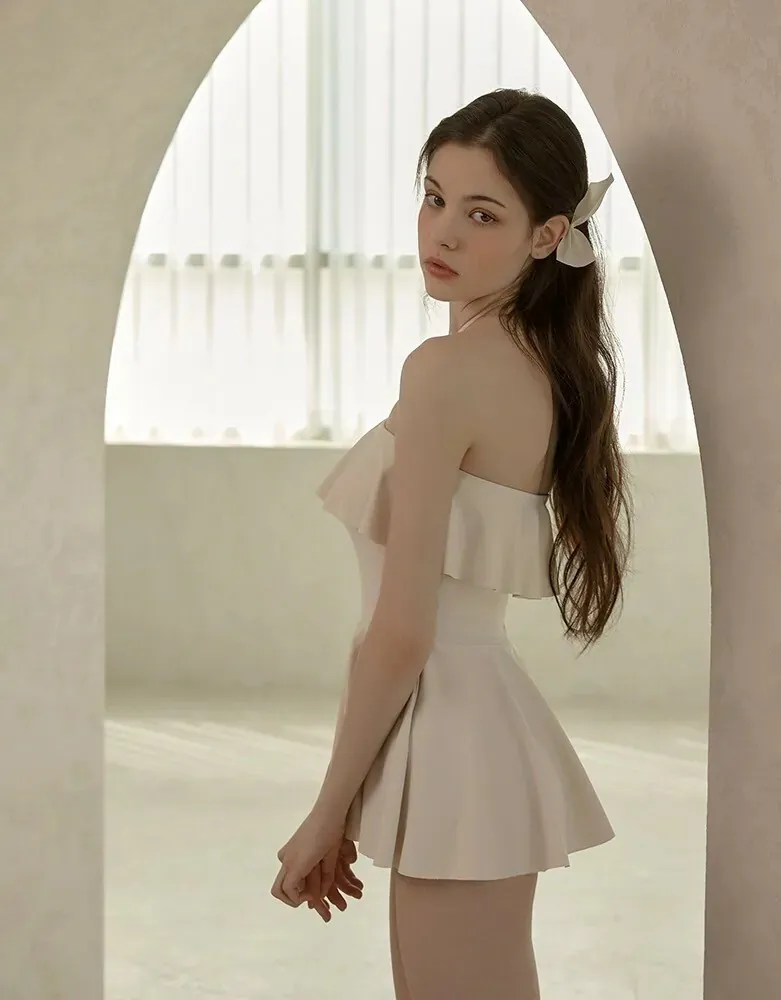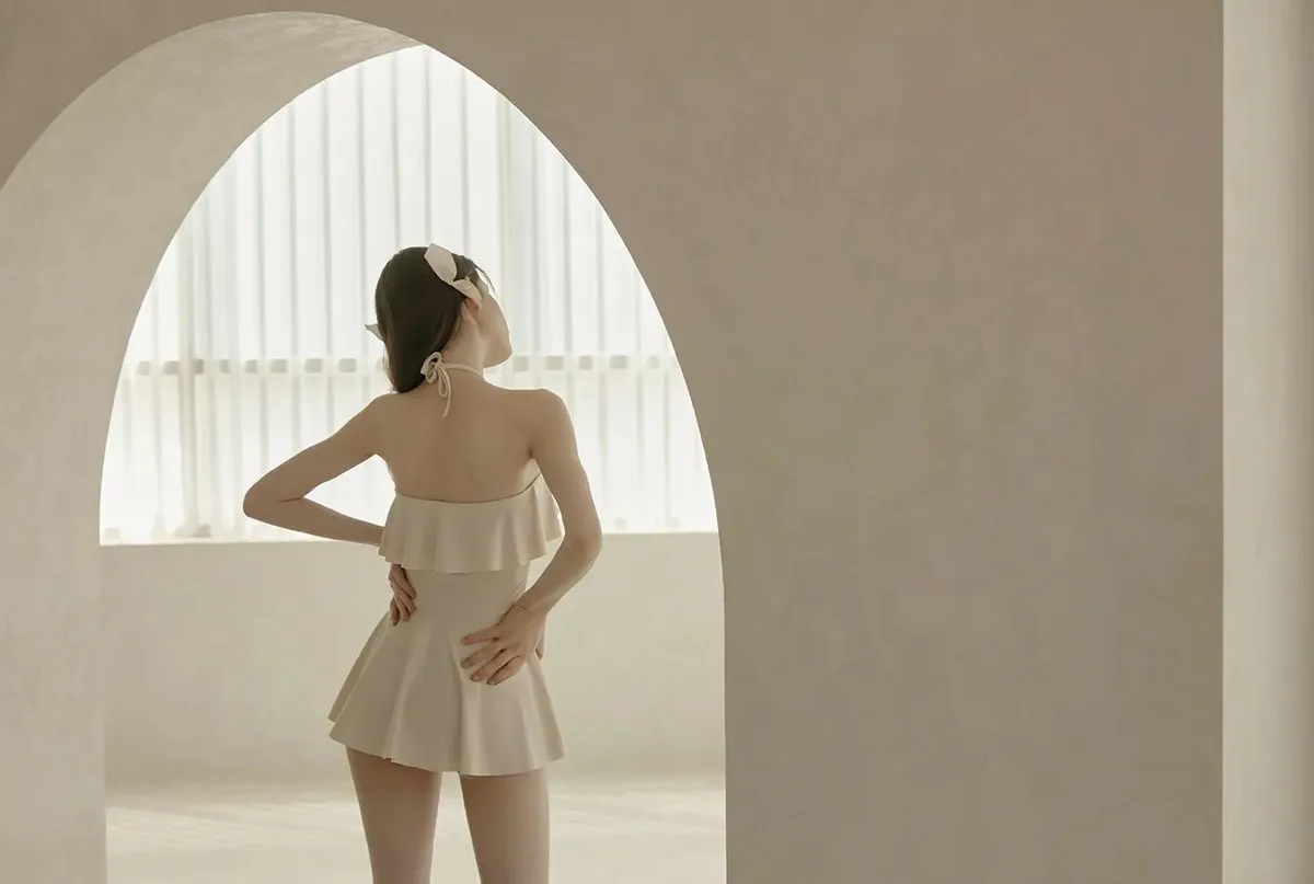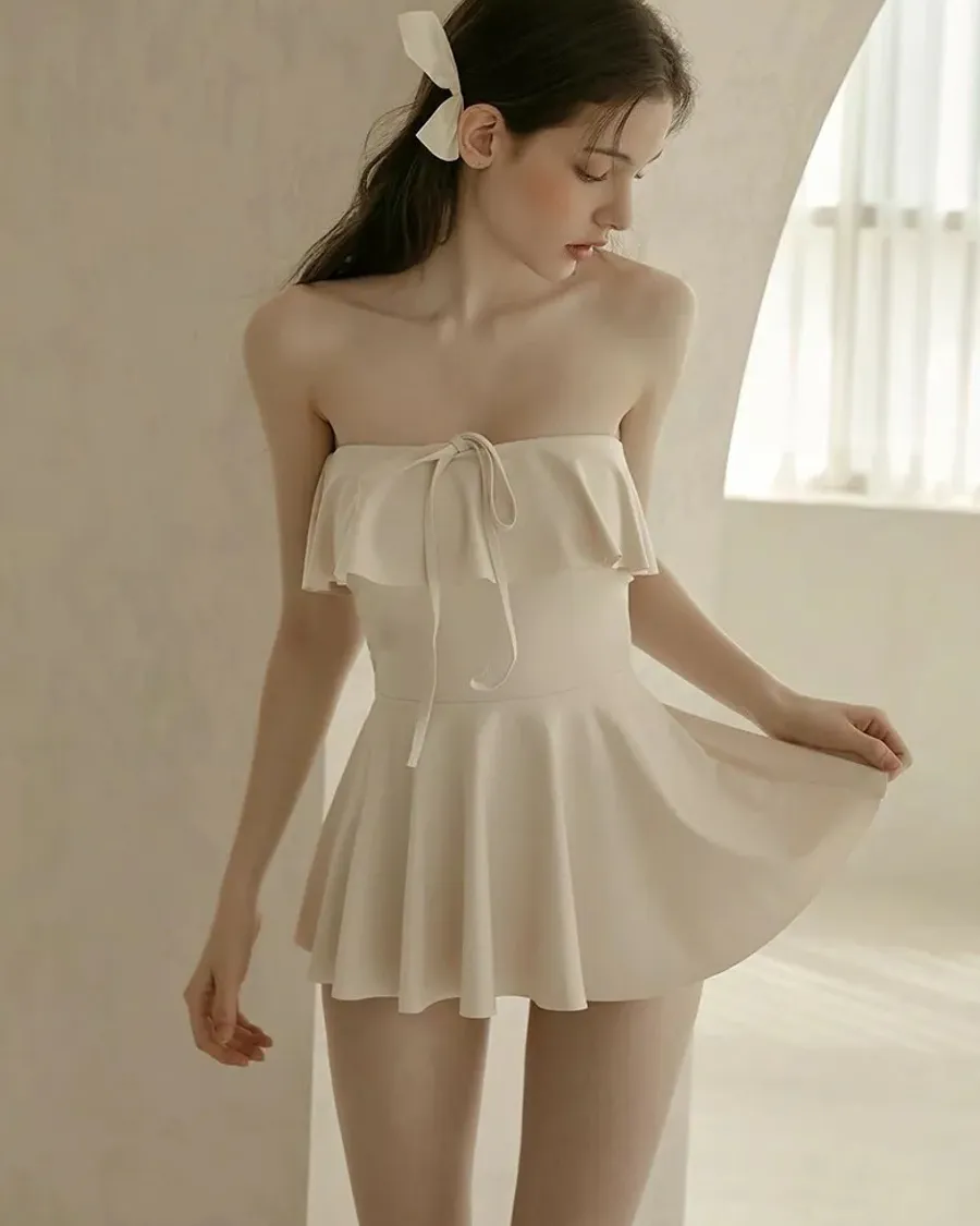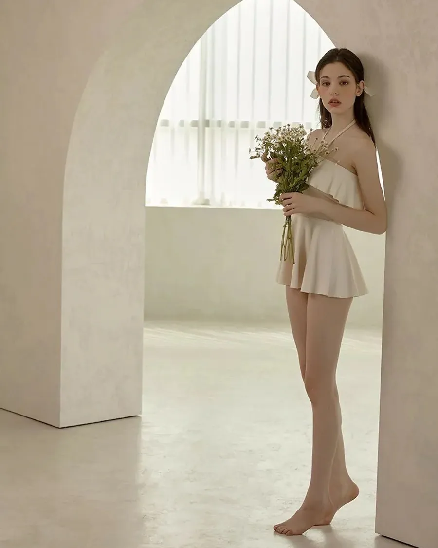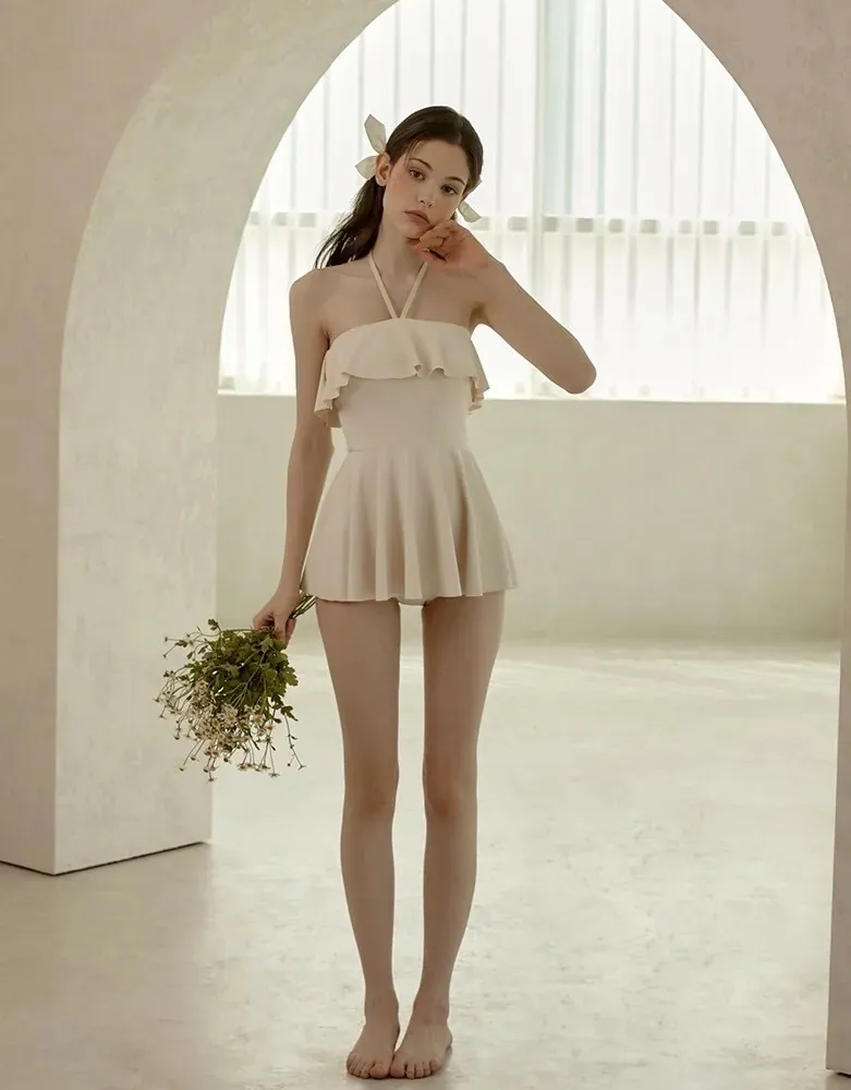 ANZ韓網代購🇰🇷VIKINIVENDER 奶油千層 掛脖連身泳裙 材質 聚酯纖維 82% 聚氨酯 18% 顏色 Ivory象牙色 尺寸( CM ) S / M 胸圍 34 / 36 臀圍 35 / 37 總長 57 / 58