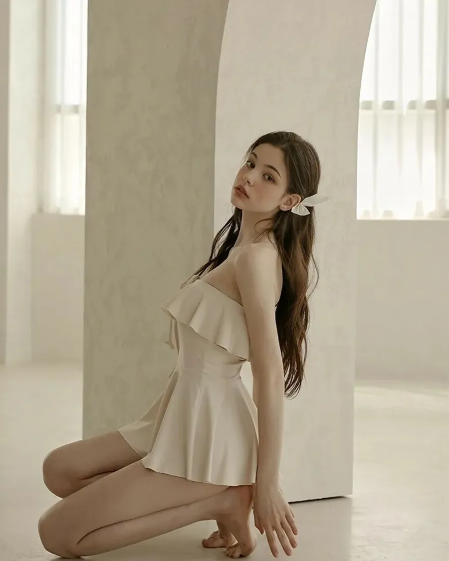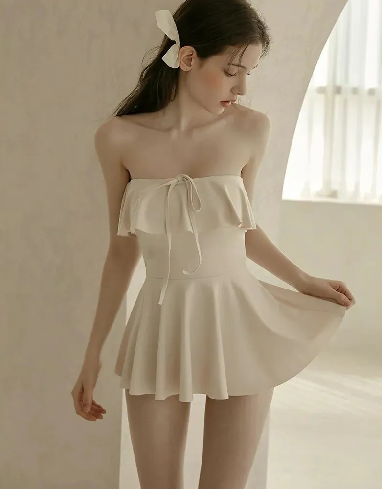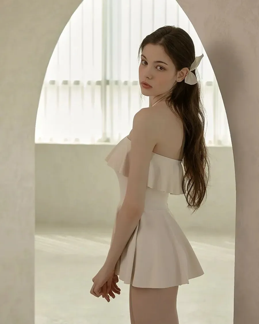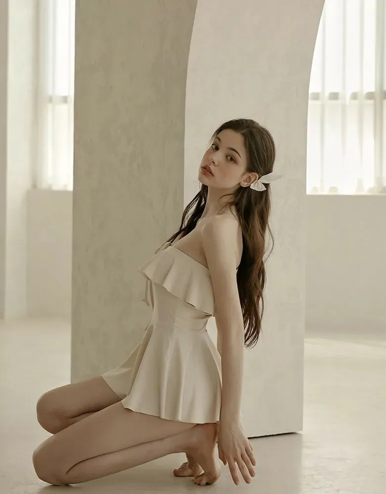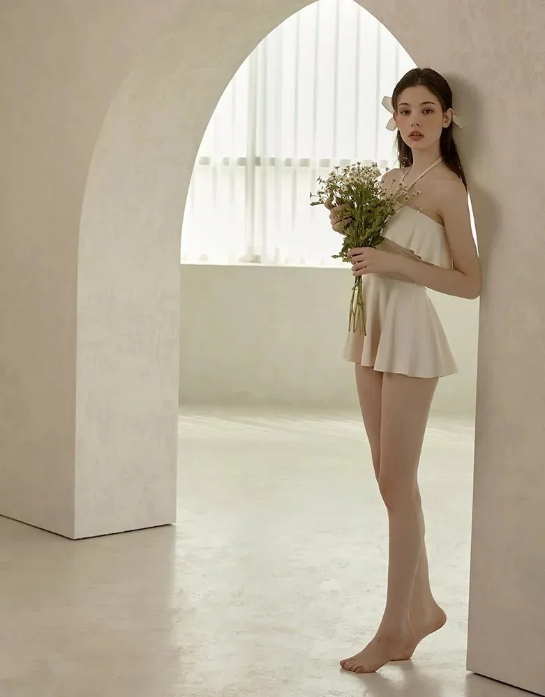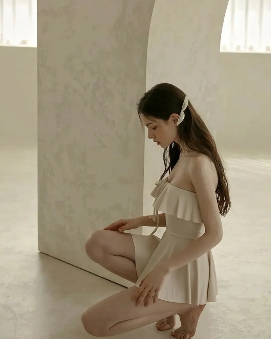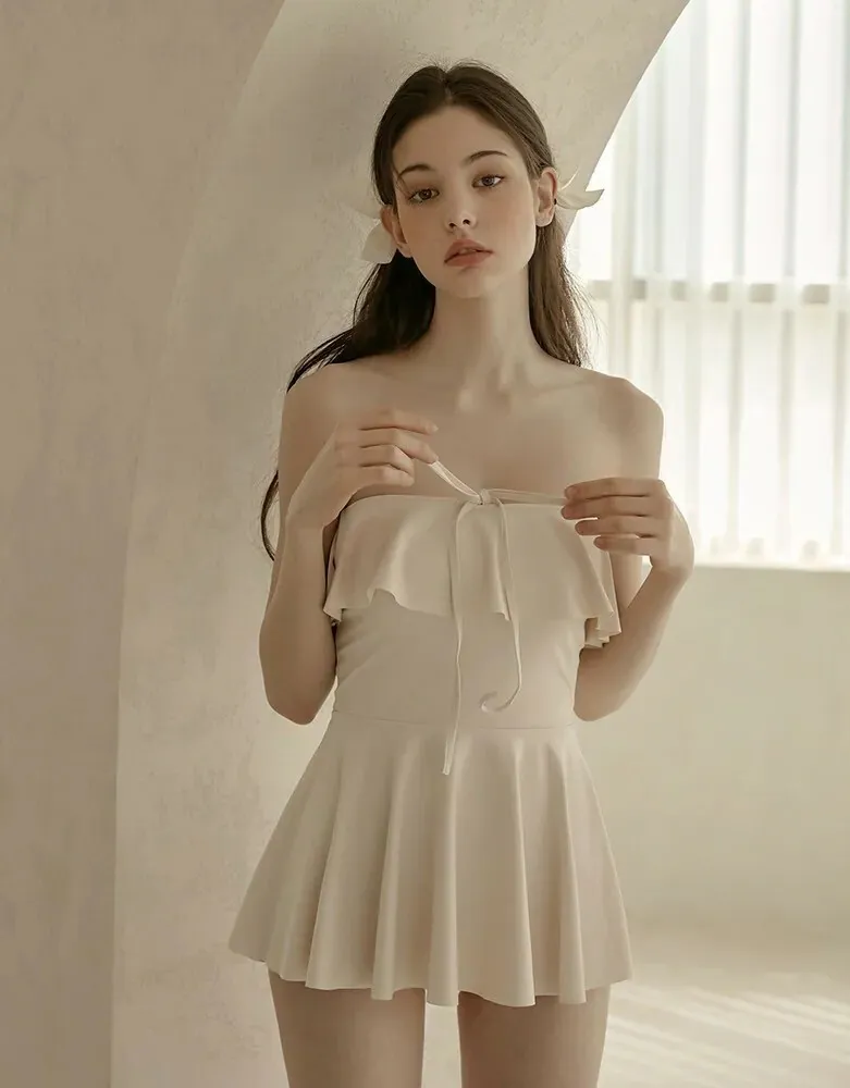 ANZ韓網代購🇰🇷VIKINIVENDER 奶油千層 掛脖連身泳裙 材質 聚酯纖維 82% 聚氨酯 18% 顏色 Ivory象牙色 尺寸( CM ) S / M 胸圍 34 / 36 臀圍 35 / 37 總長 57 / 58