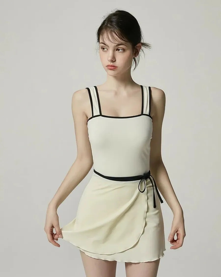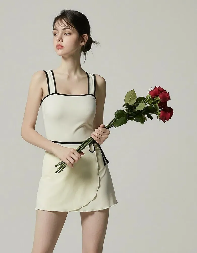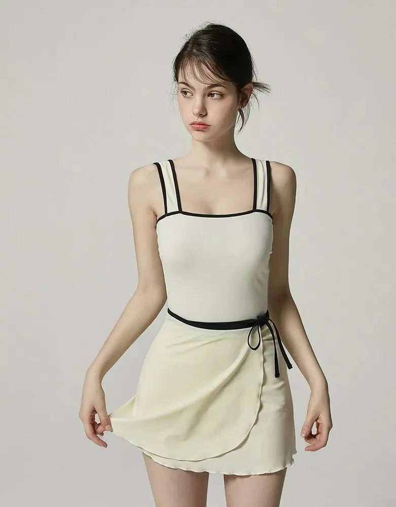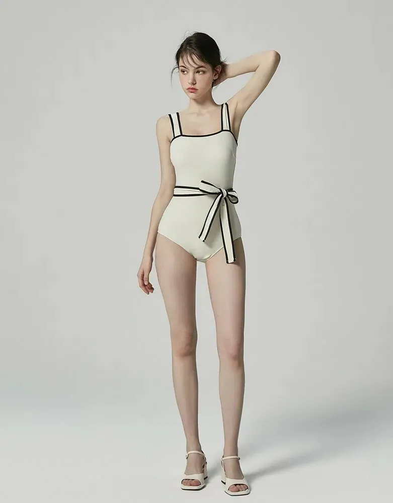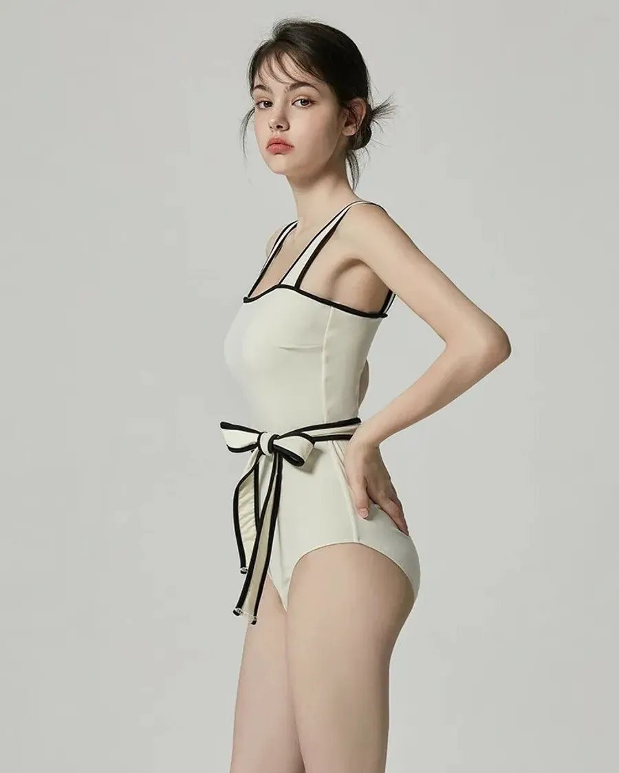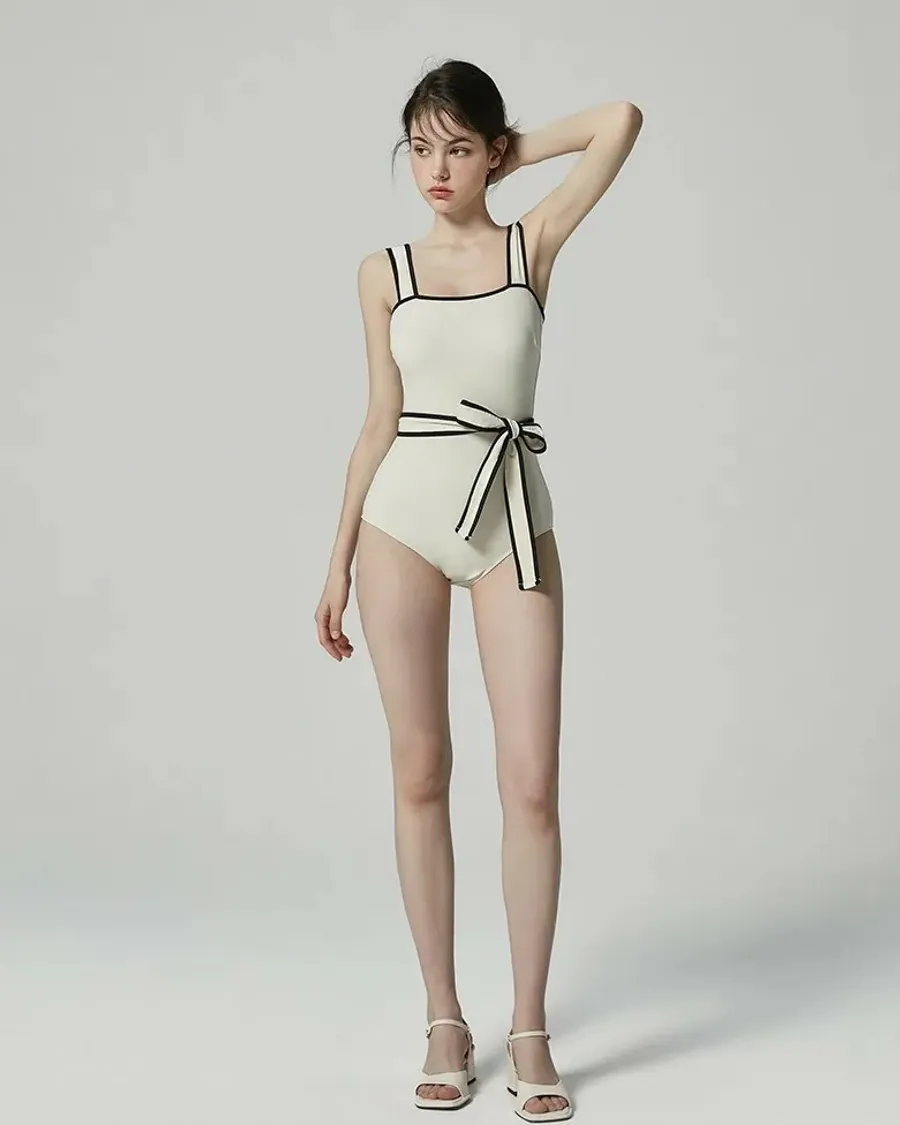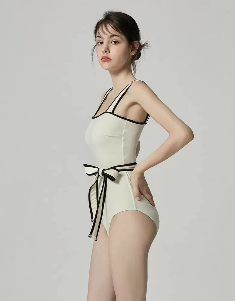 ANZ韓網代購🇰🇷VIKINIVENDER 撞色緞帶連身泳裝 象牙色