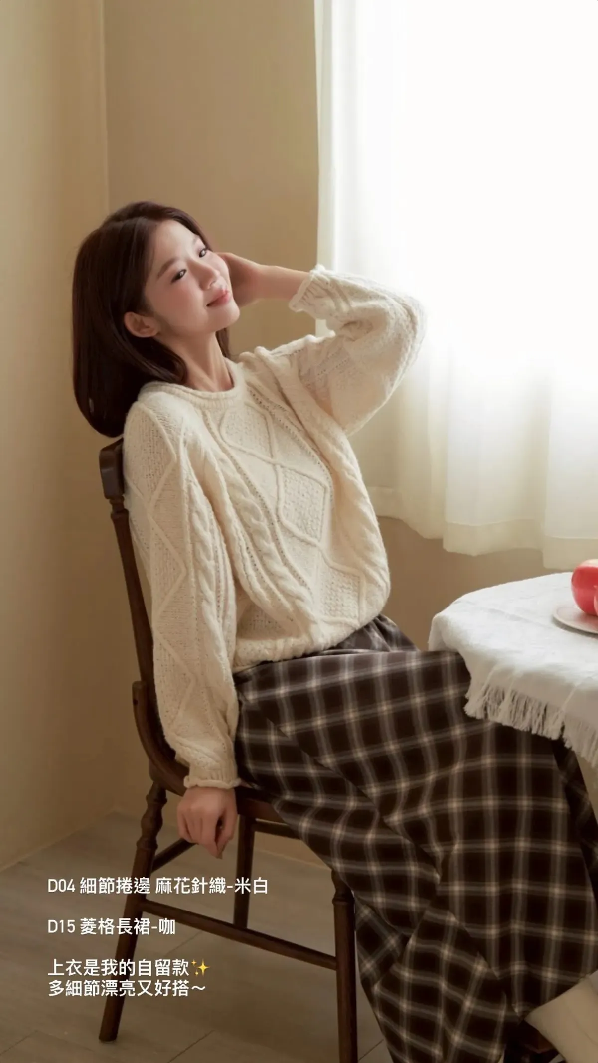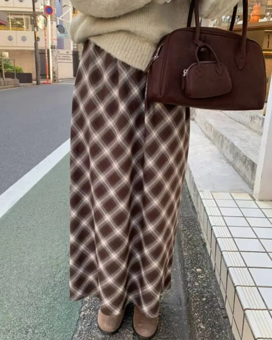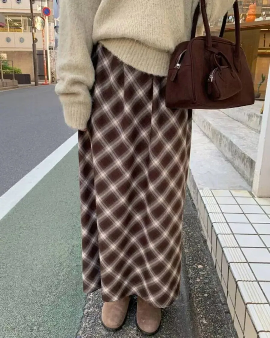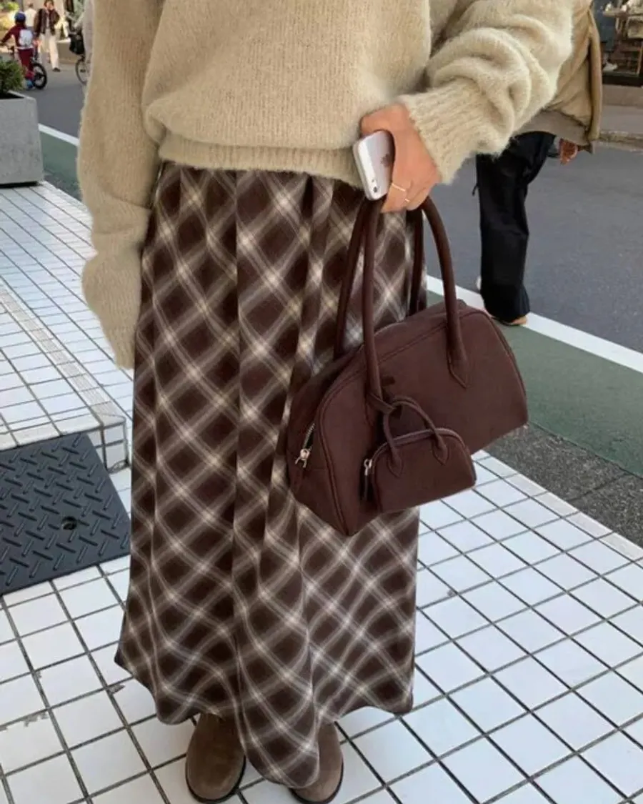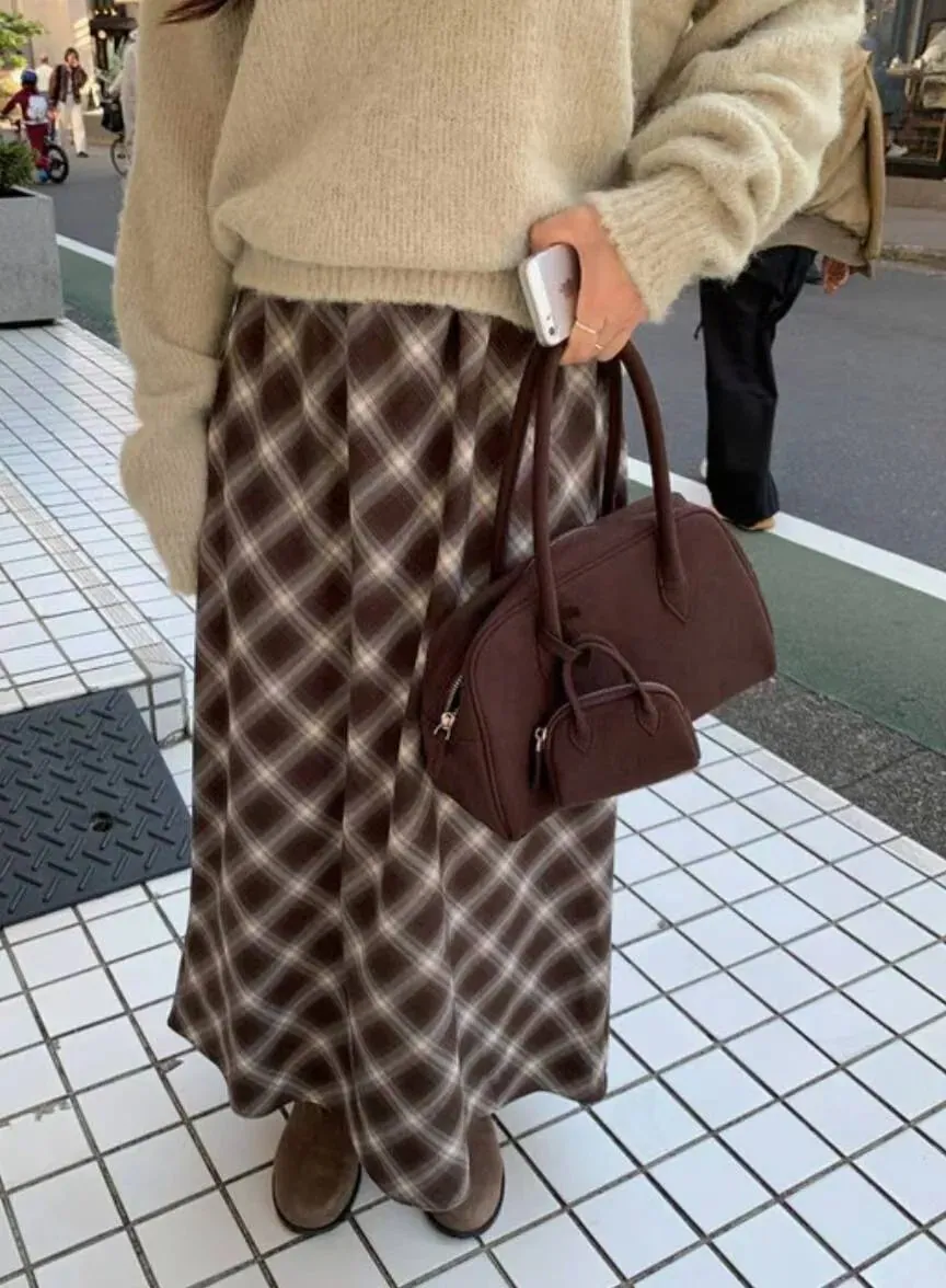 D15 漂亮咖色菱格長裙 鬆緊腰帶
